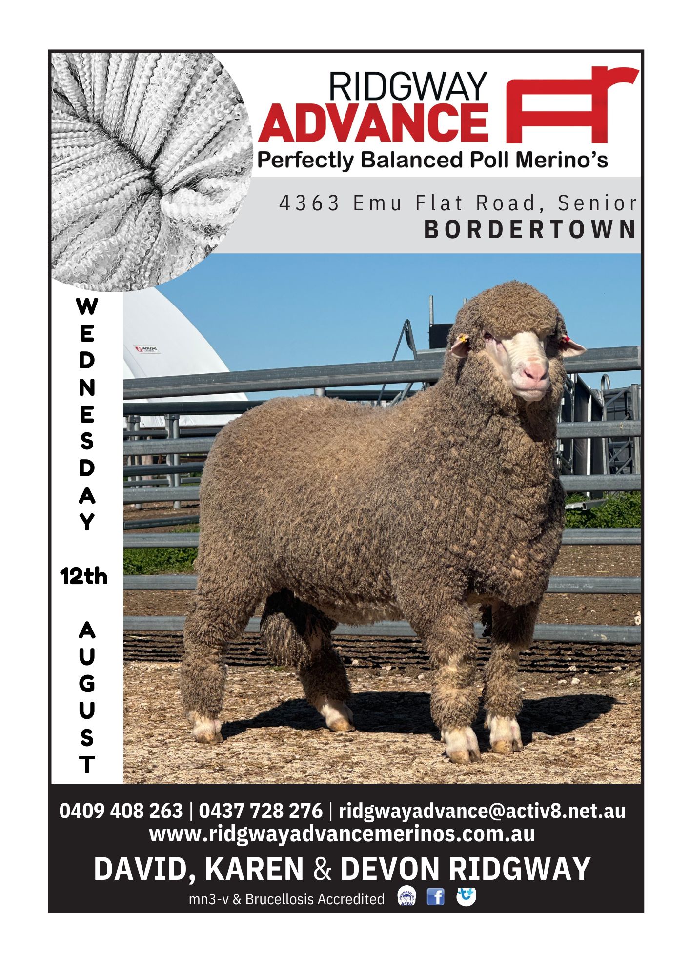 David, Karen and Devon Ridgway proudly invite you to the Ridgway Advance Annual On-Property Ram Sale on Wednesday, August 12th, 2026 at 4363 Emu Flat Road, Senior, Bordertown in South Australia’s South East.